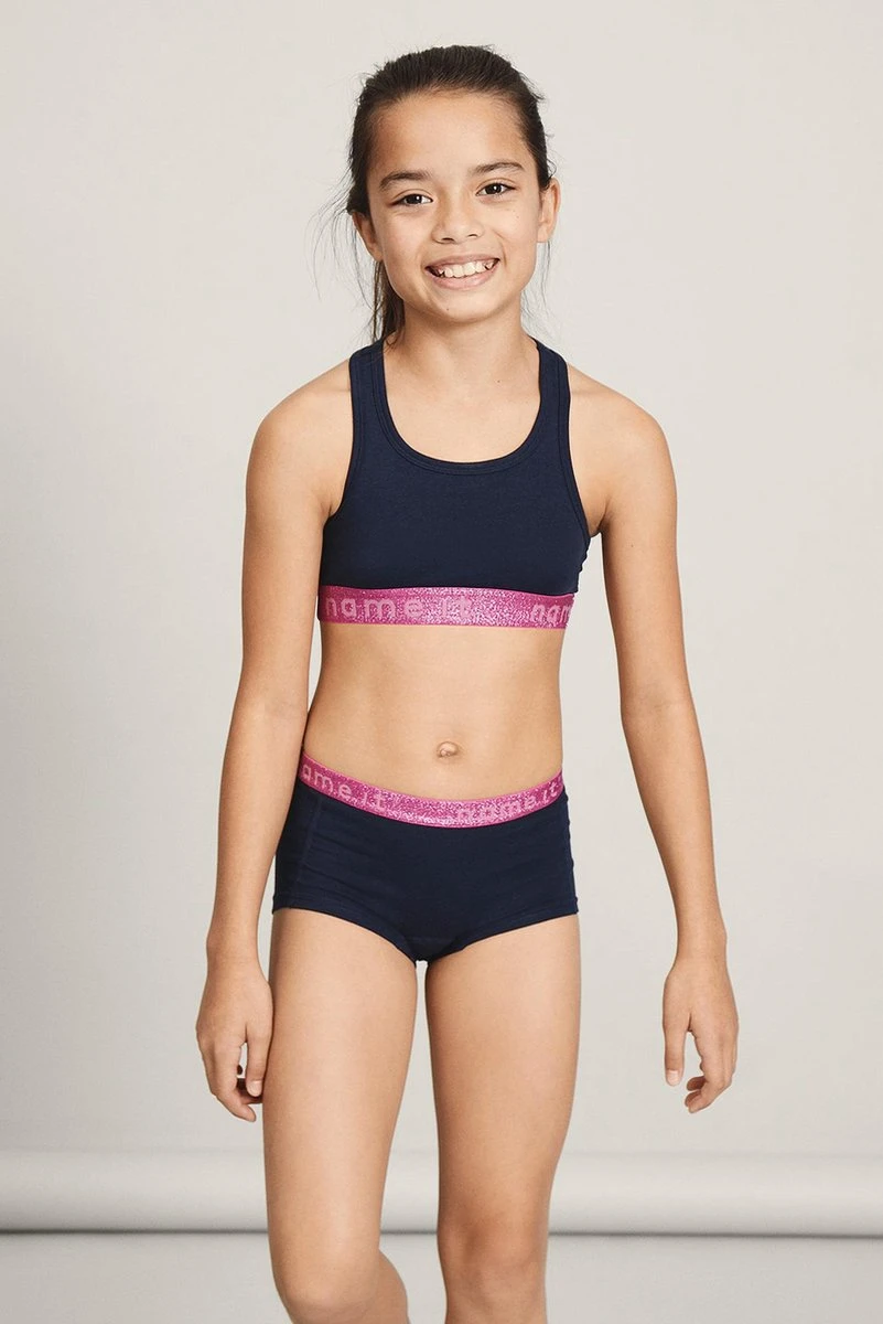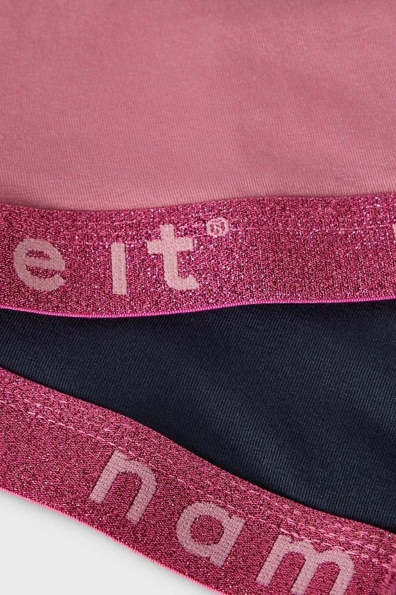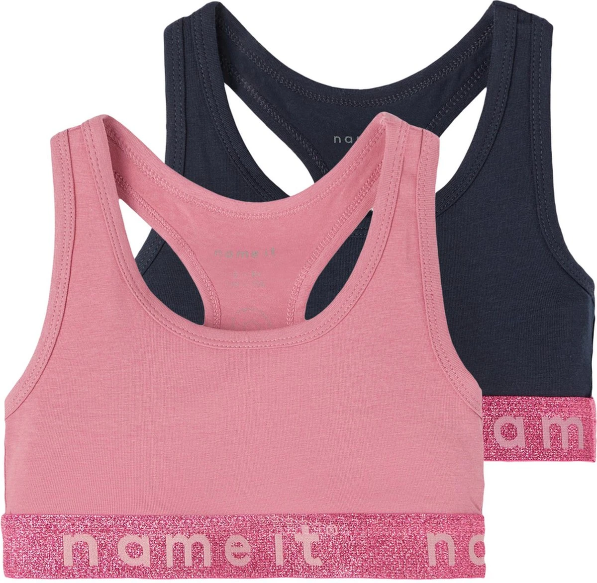 Set van 2 crop tops van Name It. De tops hebben een racerback en zijn gemaakt van biologisch katoen. Die elastische boord is voorzien van het logo en lurex glitterdraad. Lauw strijken max 110°c, Machinewas 40°c, Niet bleken, Niet in de droger, Niet stomen