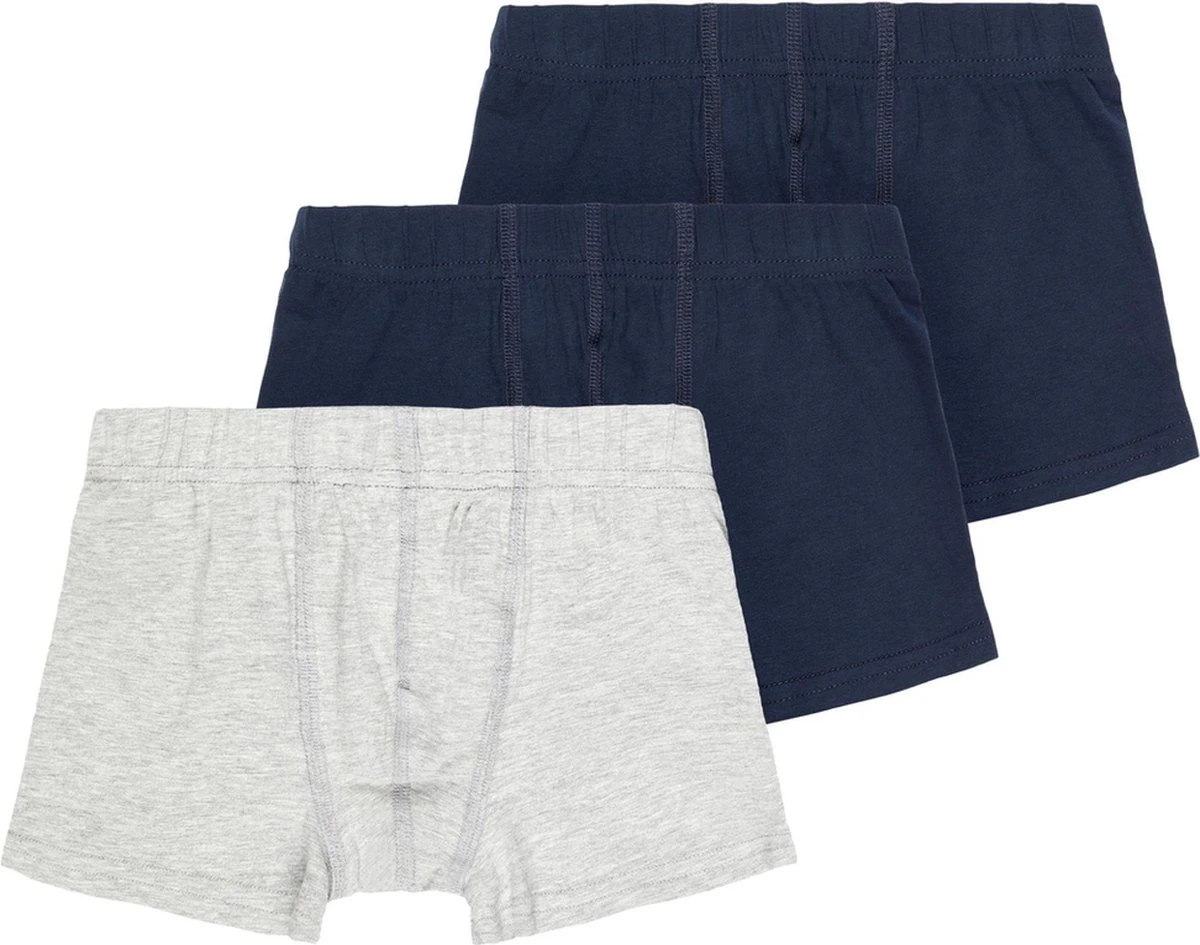 Set van 3 boxershorts van Name It. De set bestaat uit een grijze boxer en twee blauwe boxers. Dit model heeft een elastische taille en is gemaakt van duurzaam materiaal. Lauw strijken max 110°c, Machinewas 40°c, Niet bleken, Niet in de droger, Niet stomen