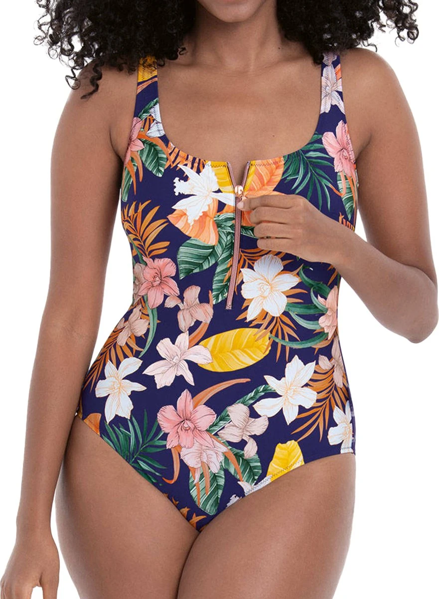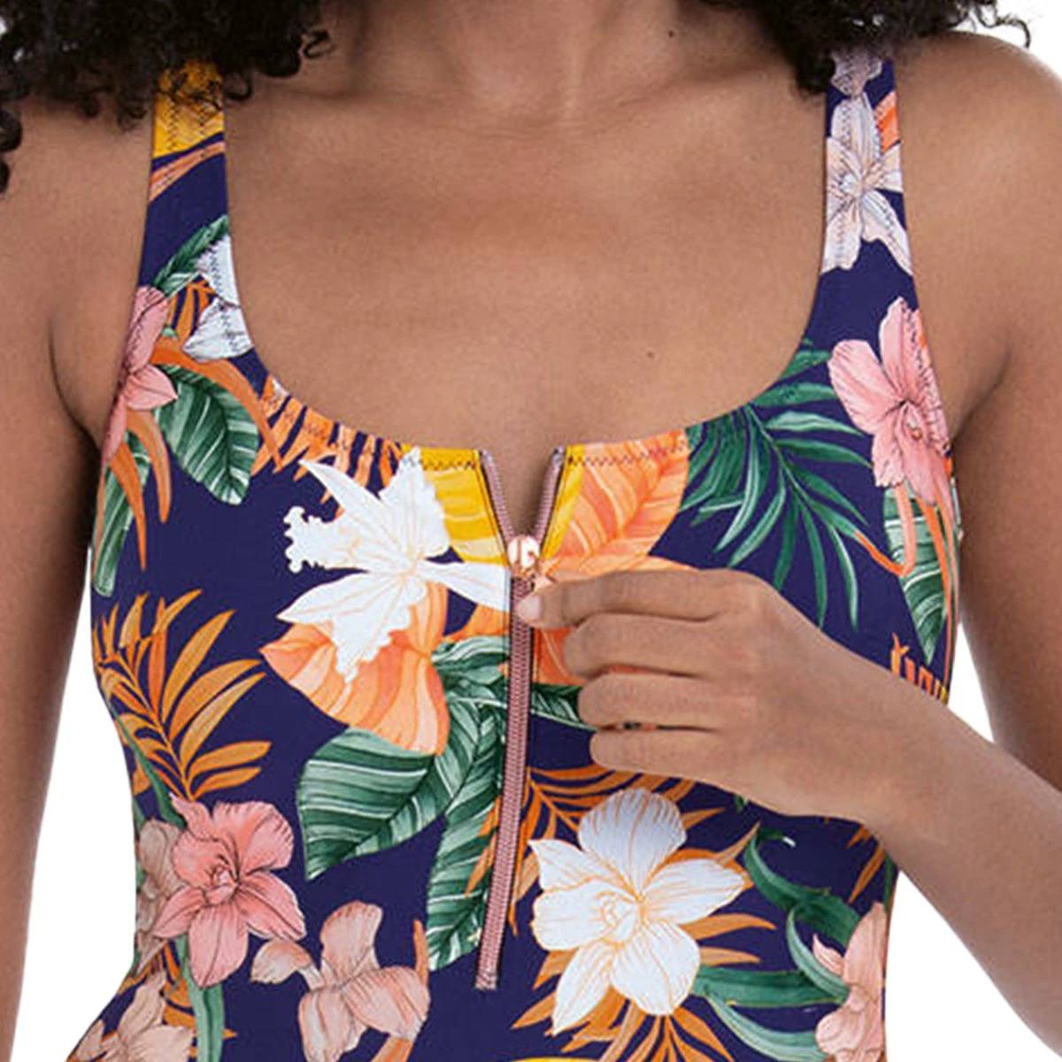 Zwempak uit de Tropical Sunset serie met kleurrijk bloemenpatroon. Ronde, lage rughals en verstelbare bandjes. Met modieuze ritssluiting aan de voorkant. Een stijlvolle metgezel voor uw volgende strandvakantie!